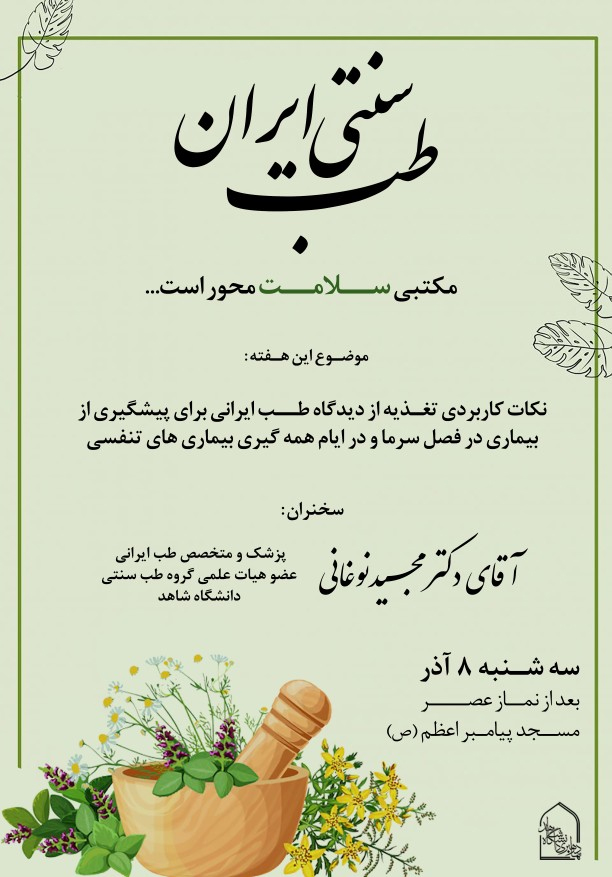 یبیماری در فصل سرما و در ایام همهگیری بیماریهای تنفسی” و سخنرانی دکتر مجید نوغانی، عضو هیات علمی گروه طب سنتی دانشگاه، سهشنبه 8 آذر ماه، بعد از نماز عصر در مسجد پیامبر اعظم (ص) برگزار میگردد.